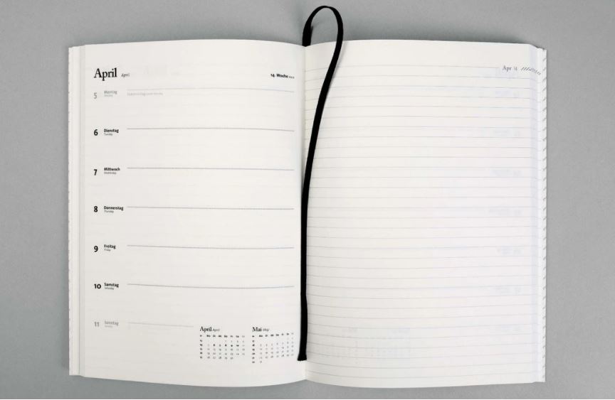 Der zweisprachige Kalender ist mit zwei Lesebändchen ausgestattet und einer Froschtasche im hinteren Buchdeckel. Ein extra Adressheft liegt bei, damit nicht jedes Jahr die wichtigsten Kontakte umgetragen werden müssen. Der Planer ist mit einem Einband aus schwarzer, hellgrauer oder brauner Zellpappe erhältlich, jeweils eingefasst mit einer stabilen Metallkante. Ein schwarzer Flachgummi dient zum Verschließen, damit nichts verloren gehen kann.