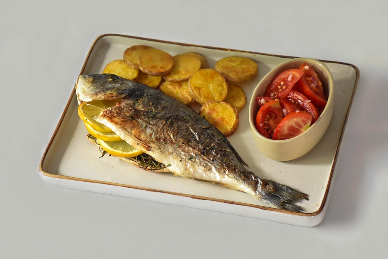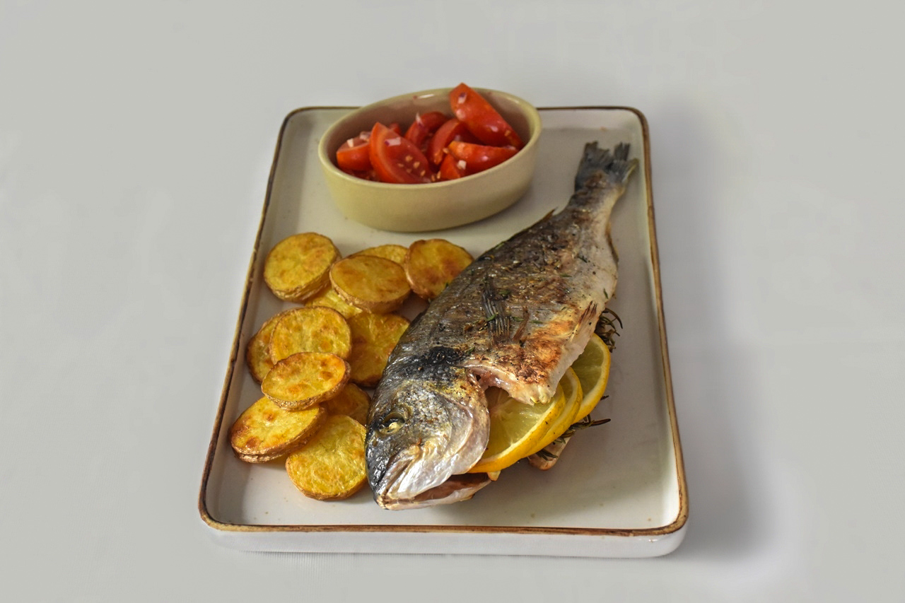 gegrillte Goldbrasse mit Ofenkartoffeln und Tomatensalat