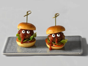 Caprese ist ein recht einfacher italienischer Salat aus Mozzarella, Tomaten und Basilikum, welcher ursprünglich aus der Gegend um Capri kommt. Der klassische Salat bekommt bei diesem Rezept einen schaurigen Look, perfekt für Halloween! Dabei sind die Mini Mozzarella Bällchen im Backofen schnell in Form gebracht, dadurch erhält der Käse eine etwas festere gummiartige Konsistenz. Sehr lecker und perfekt für das Halloween Buffet oder Dinner!