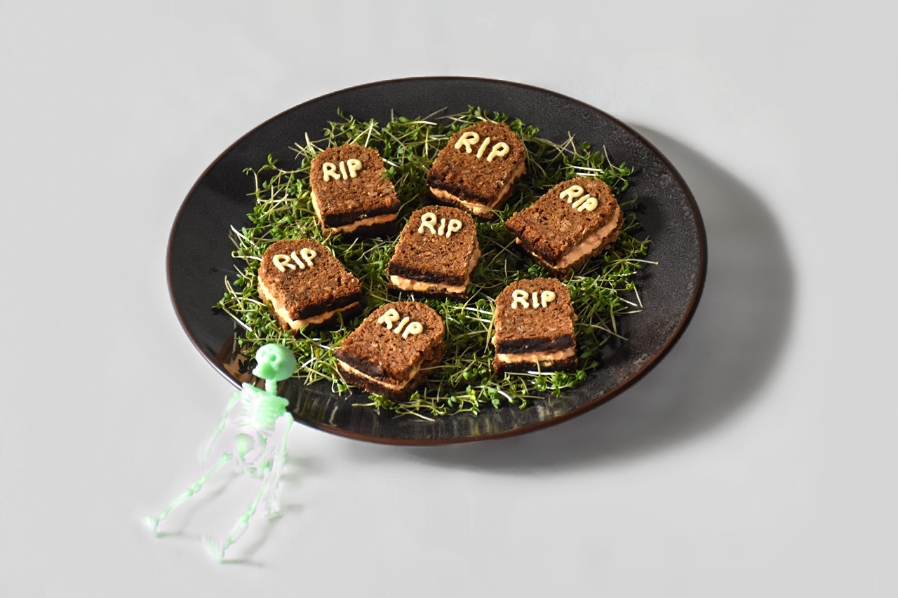 Mit ein paar einfachen Handgriffen werden aus normalen Brotscheiben gruselige Mini-Grabsteine, die auf einem „Rasen“ aus frischer Kresse serviert werden. Der Hingucker auf jedem Halloween-Buffet – und garantiert blitzschnell gemacht!