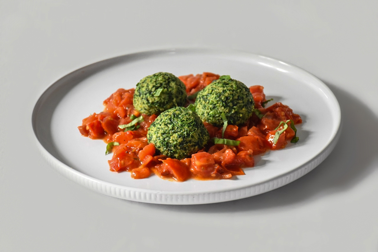 Die fein abgeschmeckten Bällchen treffen auf ein aromatisches Tomatenragout – ein vegetarisches Gericht, das mit mediterraner Leichtigkeit und herzhaftem Geschmack überzeugt. Die aromatischen Bällchen aus cremiger Polenta, frischem Spinat und Kräutern bilden einen harmonischen Kontrast zur fruchtigen Tomatensauce. Ideal als leichte Hauptspeise oder raffinierte Vorspeise – einfach, ehrlich und voller Geschmack.