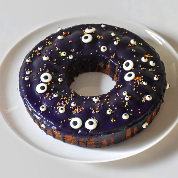 Wenn Schokolade auf Halloween trifft, entsteht dieser herrlich schaurig-süße Monsterkuchen! Der saftige Schokokuchen mit knackigen Schokostückchen wird in einer Kranzform gebacken und anschließend mit einem violetten Zuckerguss überzogen…